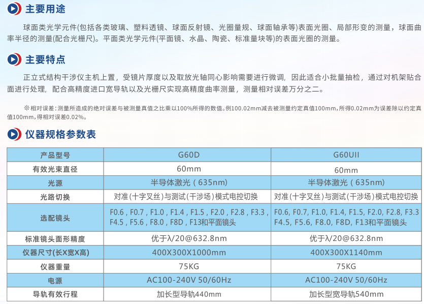 G60UI1正立式激光干涉儀通光口徑為60mm,鏡頭上置,儀器具備良好的隔振功能,適合光學(xué)車間現(xiàn)場的制程檢驗,拼盤檢驗,小批量多品種的光學(xué)鏡片檢驗。標(biāo)準(zhǔn)鏡頭有F0.6,F(xiàn)0.7,F(xiàn)1.0,F(xiàn)1.4,F(xiàn)2.0,F(xiàn)2.8,F(xiàn)3.3,F(xiàn)4.5,F(xiàn)5.6,F(xiàn)8.0,F(xiàn)8D,F(xiàn)13和平面鏡頭等,可定制其他F數(shù)的鏡頭。