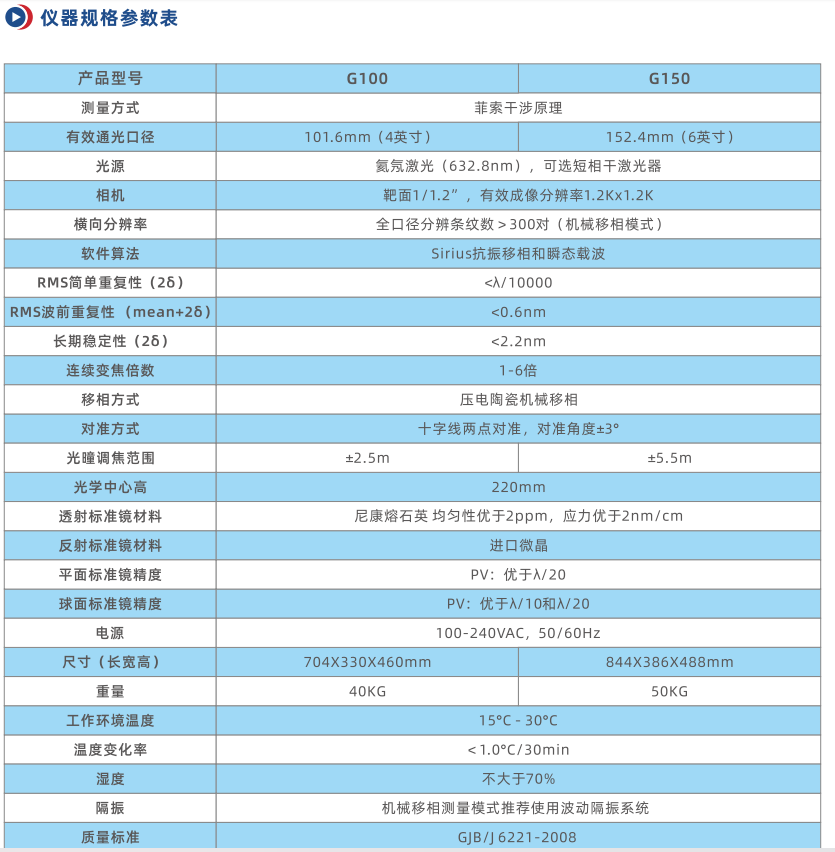 G100、G150和G200激光干涉儀的有效口徑分別為101.6mm(4英寸)、152.4mm(6英寸)和200mm。菲索型的共光路設(shè)計結(jié)合Sirius抗振移相干涉條紋分析軟件實現(xiàn)高精度的面形和波前測量。可擴展成立式平面和倒立式球面等多種結(jié)構(gòu)形式的干涉儀。