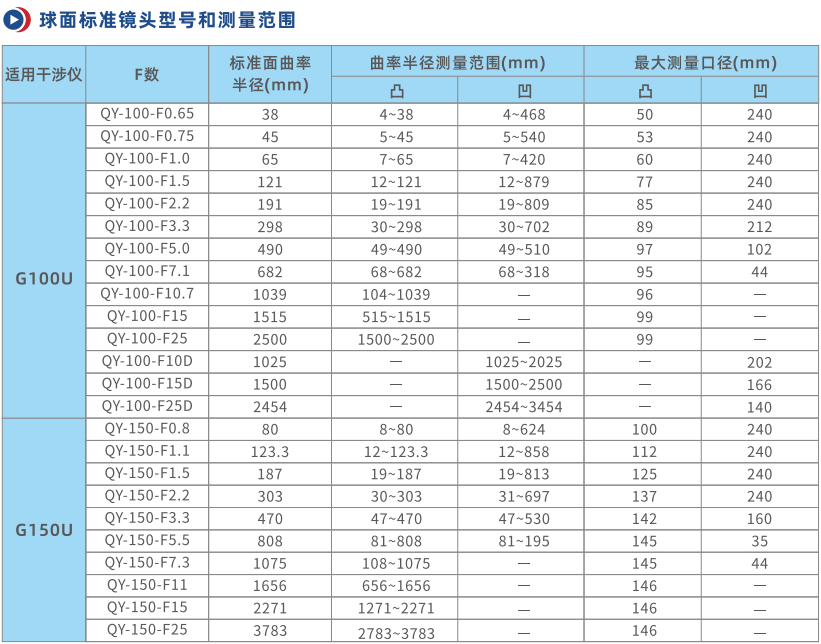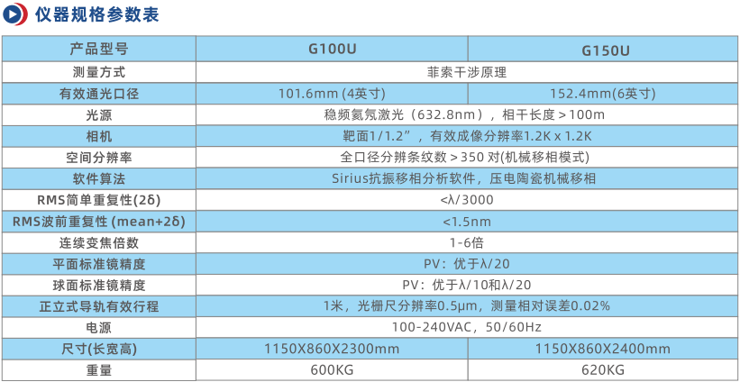 G100U和G150U是乾曜光學(xué)新開發(fā)的兩款正立式激光干涉儀工作站,有效口徑分別為101.6mm(4英寸)和152.4mm(6英寸)。可以測(cè)量平面面形、球面面形和曲率半徑,選配雙五維載物臺(tái),可以測(cè)量透過波前和非球面的補(bǔ)償法測(cè)量。
