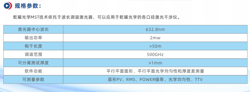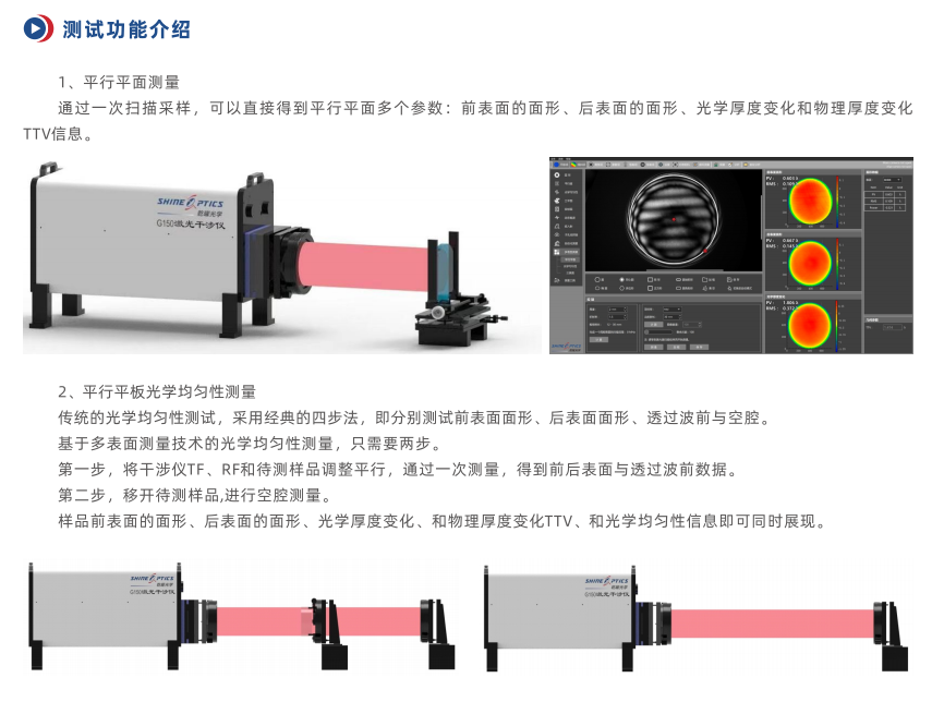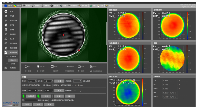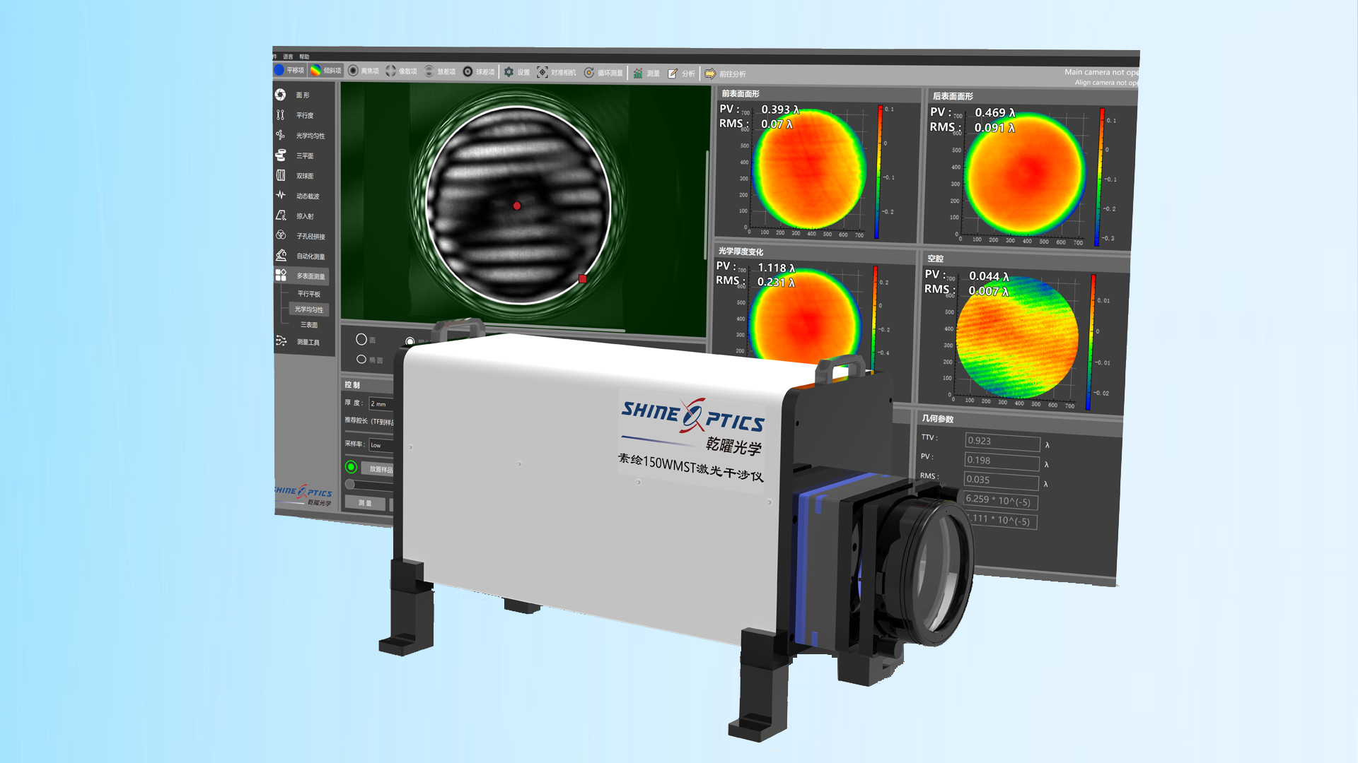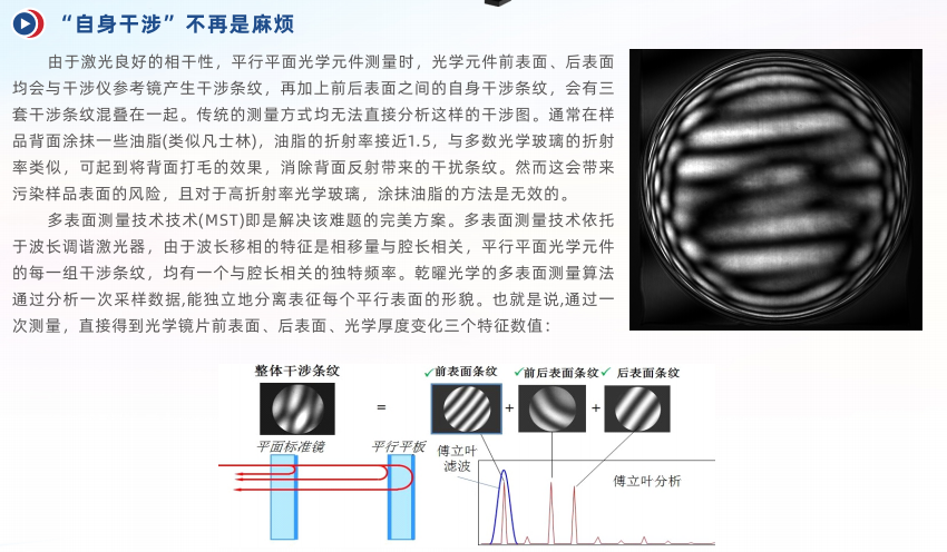 多表面測量技術(shù)技術(shù)(MST)即是解決該難題的完美方案。多表面測量技術(shù)依托于波長調(diào)諧激光器,由于波長移相的特征是相移量與腔長相關(guān),平行平面光學(xué)元件的每一組干涉條紋,均有一個(gè)與腔長相關(guān)的獨(dú)特頻率。乾曜光學(xué)的多表面測量算法通過分析一次采樣數(shù)據(jù),能獨(dú)立地分離表征每個(gè)平行表面的形貌。也就是說,通過一次測量,直接得到光學(xué)鏡片前表面、后表面、光學(xué)厚度變化三個(gè)特征數(shù)值。